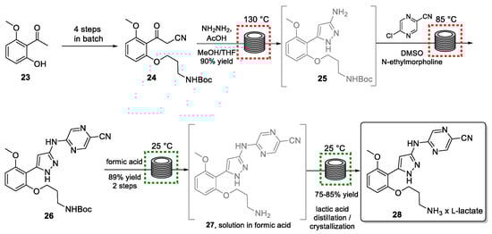 Product 26 was subsequently subjected to Boc-group removal using formic acid, as well as salt exchange (formate to lactate), as part of the flow process. Final purification of target 28 was achieved via already established batch protocols. By using this integrated continuous process for small volume continuous (SVC) manufacturing, the authors succeeded in producing 24 kg of prexasertib monolactate monohydrate (28) for use in clinical trials.