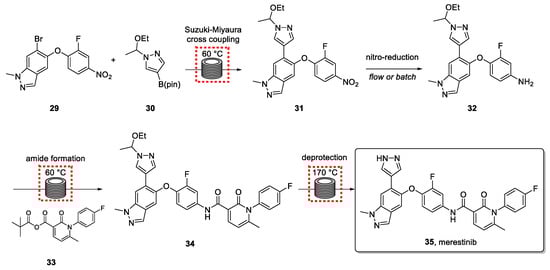 Merestinib (35) is an experimental anticancer drug under development by Eli Lilly. It is studied for the treatment of advanced biliary tract cancer, non-small cell lung cancer, and solid tumors [75,76]. The batch synthesis of the drug presents risks due to known potentially genotoxic impurities (GTIs).