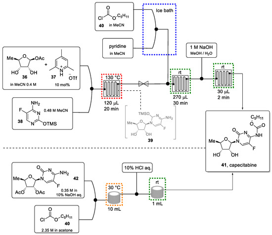 In 2012, Jamison and Shen reported a greener approach that involves a continuous process (Scheme 8) [84]. After initial optimization work, the Vorbrüggen glycosylation reaction between 5-deoxy-ribose (36) and the corresponding silylated thymine derivative (38) was achieved in only 20 min reaction time using a small PFA tubing microreactor (120 μL volume). The exiting reaction mixture was directed into a second reactor where carbamoylation took place by the introduction of pentyl chloroformate. Acetyl-groups that served as protection groups on the sugar moiety during the initial reactions were eventually removed in a third reactor using a solution of NaOH in MeOH/H2O. This three-step flow protocol afforded capecitabine in 72% yield in less than 1 h in a clearly greener and more efficient manner compared to the batch procedure.
