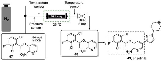 - Xu, F.; Chen, J.; Xie, X.; Cheng, P.; Yu, Z.; Su, W. Synthesis of a Crizotinib Intermediate via Highly Efficient Catalytic Hydrogenation in Continuous Flow. Org. Process Res. Dev. 2020, 24, 2252–2259. [Google Scholar] [CrossRef]