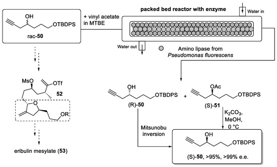 - Krishna, A.S.; Basetty, S.; Nasam, R.; Ralte, S.L.; Reddy, C.R.; Sudhakar, G.; Pabbaraja, S.; Chandrasekhar, S.; Mainkar, P.S.; Kumaraguru, T.; et al. Chemoenzymatic Process for the Preparation of (S)-7-((Tert-Butyldiphenylsilyl)Oxy)Hept-1-Yn-4-Ol in a Continuous Packed-Bed Reactor, a Key Intermediate for Eribulin Synthesis. Org. Process Res. Dev. 2020, 24, 2657–2664. [Google Scholar] [CrossRef]