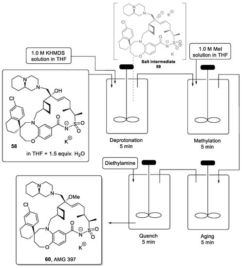 - Tom, J.K.; Achmatowicz, M.M.; Beaver, M.G.; Colyer, J.; Ericson, A.; Hwang, T.; Jiao, N.; Langille, N.F.; Liu, M.; Lovette, M.A.; et al. Implementing Continuous Manufacturing for the Final Methylation Step in the AMG 397 Process to Deliver Key Quality Attributes. Org. Process Res. Dev. 2021, 25, 486–499. [Google Scholar] [CrossRef]