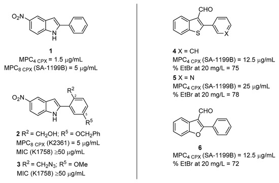 One year later, on the back of the good results obtained around the nitro-indole moiety as essential scaffold for NorA EPI activity, Fournier et al. [56] undertook an extensive synthetic effort to develop arylbenzo[b]thiophene and diarylthiophene derivatives with the aim to evaluate the importance of the indolic nitrogen atom for NorA inhibition. No compounds showed any antibacterial effect at concentrations lower than 100 µg/mL against S. aureus ATCC 25923 (Table 1); however, no MIC values were determined against SA-1199B (Table 1), the S. aureus strain used for synergistic assays, thus making it impossible to ascertain, though synergism was influenced by a direct antibacterial activity. A key requirement to possess synergistic activity in the arylbenzothiophene class was the presence of an aldehyde group at C-3 position coupled with substitutions on the C-2 phenyl ring in para position rather than meta or ortho positions. However, compounds with the aldehyde group at C-3 and an unsubstituted C-2 phenyl ring (4—Figure 2) or a C-2 pyridin-3-yl portion (5—Figure 2) showed promising MPC4 values (≤25 µg/mL). On the other hand, benzothiophene derivatives bearing –CN, a –OCH3, or a –OCH2CF3 groups at C-3 or even aryl moiety shifted from C-2 to C-3 exhibited MPC4 values ≥50 µg/mL. Interestingly, when the main nucleus was shrunk by benzene removal to give thiophene derivatives, the synergistic effect was completely lost, regardless of substituents. On the contrary, sulphur replacement of the benzothiophene with an oxygen atom yielded the benzofuran derivative (6—Figure 2) that retained the same activity as its close structural analogue 4. For the best compounds 4-6, NorA inhibition at 20 µg/mL was confirmed by EtBr efflux assays in comparison with RES. Finally, the cytotoxic profile was assessed for a large panel of derivatives against three different cell lines: keratin-forming tumor HeLa (KB), breast cancer (MCF7) and breast carcinoma (MCF7R). Unfortunately, derivatives 4 and 6, at lower concentrations (10 µM) than those needed for NorA inhibition, showed a significant inhibition of the human cell growth. The only exception was derivative 5, which exhibited a weak inhibition of KB cell growth and no significant effect against MCF7 and MCF7R; however, the tested concentration for cytotoxic assessment was about 10-fold lower than its MPC4. Thus, although the authors reported arylbenzo[b]thiophene derivatives as NorA inhibitors for the first time, much needs to be done to improve this chemical class to obtain more potent and safer compounds. Moreover, the authors should reconsider the initial assumption to remove the –NO2 group present in indole 1 in an attempt to increase NorA EPI activity. Indeed, a direct comparison of the EPI activity of 1 with the best benzothiophene derivative 4 highlights that indole moiety is preferred over the benzothiophene nucleus, even though the presence of the –NO2 group of 1 as well as the aldehyde of 4 could influence EPI activity, thereby hampering the comparison between the two nuclei.