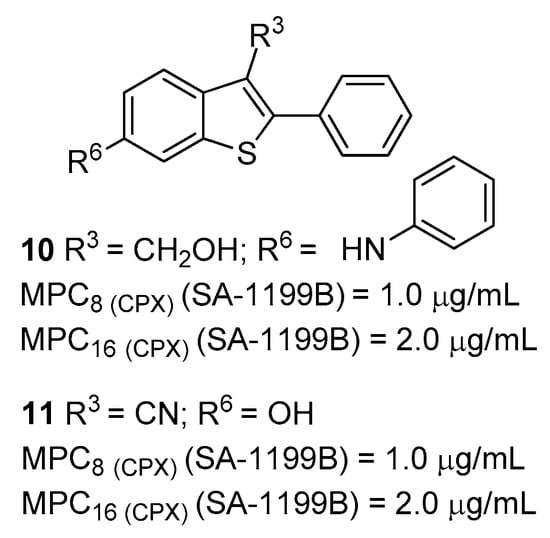 Two years later, based on a previous work aimed at obtaining the 6-bromobenzo[b]thiophene-3-carbonitrile intermediate for Raloxifen synthesis [60], Liger et al. attempted to optimize the previously identified arylbenzo[b]thiophene derivatives (i.e., 4) [61]. Although benzothiophene derivatives bearing a –CN group at C-3 did not show any NorA EPI activity in their previous work [56], the authors synthesized and tested a wide set of cyanobenzothiophene derivatives. However, the C-3 position was widely decorated with different electron-withdrawing groups in combination with an array of substituents, mainly at the C-6 position but also at C-4 and C-5. Once they excluded any antibacterial effect for all derivatives against ATCC 25923 and SA-1199B strains (Table 1), the authors assessed the synergistic effect of the compounds with CPX against SA-1199B. Although it was impossible to delineate a clear SAR around this class due to a lack of correlation between the activities of the combined substituents, some compounds showed promising synergistic activities at low concentrations. In particular, compounds 10 and 11 (Figure 4) exhibited an MPC8 of 1 µg/mL and an MPC16 of 2 µg/mL while showing an MIC > 128 µg/mL on tested strains. For both compounds, NorA inhibition was confirmed by EtBr accumulation assays at 20 µg/mL on SA-1199B by using RES as positive control. However, no synergistic assays against S. aureus strains wild-type or lacking NorA pump were performed, thereby not fully demonstrating the absence of a possible secondary synergistic mechanism, such as the increase in membrane permeability. Moreover, no human cell toxicity was assessed.