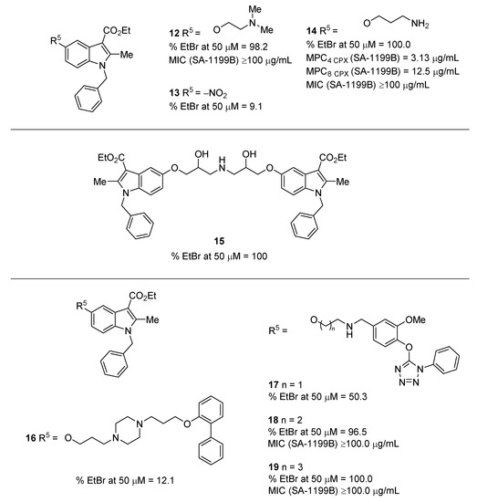 In 2016, based on the literature data reported over the years around the indole core, Lepri et al. planned a rational design aimed at obtaining potent indole-based NorA EPIs [62]. The authors performed a wide effort to enrich SAR information around the indole core using a four-step design protocol, especially focusing attention on the N-1, C-3 and C-5 positions. The first substantial modification entailed the shift of the aryl from C-2 position, as the most potent indole EPIs 1-3 (Figure 2), to N-1 position of the indole core after demonstrating a similar spatial occupancy by superimposing the new N-benzyl indole with the 2-phenyl indole using FLAP software [63]. Thus, a set of benzyl-indole derivatives with an ethylic ester function at C-3 was synthesized with different substituents at the C-5 position in order to verify the role of the –NO2 group (present in 1). All derivatives showed poor EtBr efflux inhibition at 50 µM against SA-1199B, with the exception of 12 bearing at C-5 a diethylamino ether chain (Figure 5). Interestingly, the indole derivative 13, the direct analogue of 1 within this series of compounds and with the -NO2 group at C-5, was found to be inactive, thereby highlighting that the shift of the aryl moiety from C-2 to N-1 was detrimental (Figure 5). Although derivative 12 was the first indole NorA EPI derivative with an electron-donating group at C-5, the effect did not appear to be due to the electron-donating property of the C-5 substituent since other derivatives did not show any NorA EPI activity. On the contrary, the NorA EPI activity of derivative 12 would appear to be related to the presence of the protonable alkylamino chain, which was previously identified in the quinoline scaffold (see below) and is essential to imparting NorA inhibition [64]. Thus, the authors focused their attention on the substituent at C-5, introducing several different O-alkylamino chains. Overall, all 22 derivatives retained an excellent EtBr efflux inhibition, proving the key role of the protonable alkylamino chains in obtaining NorA inhibition.