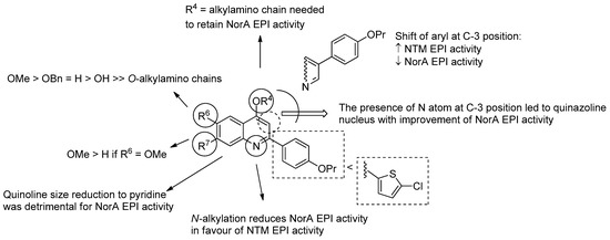Considering the high number of reported articles from the same research group about quinoline derivatives as NorA EPIs, SAR around this core was more robust than for indole derivatives. Indeed, the picture in Figure 10 fully describes the state of the art around the chemical information to obtain potent quinoline analogues as potent NorA EPIs. Briefly, since size core reduction to pyridine yielded inactive derivatives, we can consider the quinoline core as essential, even though quinazoline nucleus gave potent derivatives. The shift of the C-2 aryl moiety to the C-3 position afforded derivatives less potent as NorA EPIs, while improving NTM EPI activity (see below), similarly to what happens for the position of the alkylamino chain if moved from the oxygen at C-4 to the N-1 position.
