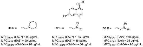 Few years later, Ghisalberti et al. reported a series of chloroquinolines as potential EPIs towards antibiotic-resistant E. aerogenes isolates [94]. Among the six synthesized derivatives, decorated with different alkylamino chains at nitrogen atom at the C-4 position, three compounds (36–38—Figure 13) at 0.310 mM (86–95 µg/mL) showed a significant reduction in CAF MIC (by 8-fold) against EA27 and EA5 strains and by 32, 16 and 8-fold, respectively, against the CM-64 strain. In parallel, all three compounds did not show any antibacterial activity on their own and any synergistic effect when tested in combination with CAF against the wild-type E. aerogenes ATCC 13048.