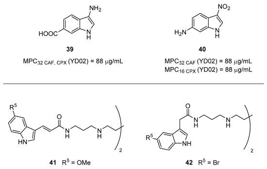In 2010, Zeng et al. reported a series of indole derivatives as AcrAB–TolC EPIs able to synergize with different antibiotics such as CAF, TET, erythromycin (ERY) and CPX against different E. coli strains (including the wild-type ATCC 25922 and the resistant YD02—Table 1) [39]. By synergistic assays, compound 39 (Figure 14) at 0.5 mM (88 µg/mL) was able to reduce the CAF and CPX MICs by 32-fold against the YD02 strain. In parallel, compound 40 (Figure 14) at 0.5 mM (88.0 µg/mL) showed synergistic activities with all the used antibacterials, with MIC reductions ranging from 4 to 32-fold against the YD02 strain. Poor synergistic effects of 39 and 40 with antibacterials were observed against the wild-type strain ATCC 25922 (Table 1). Unfortunately, for the two best compounds, MIC evaluation, checkerboard assays and accumulation assays of antibiotics were not performed.