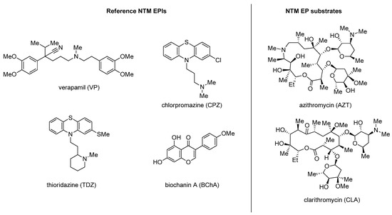 Reference NTM EPIs verapamil (VP), chlorpromazine (CPZ), thioridazine (TDZ) and biochanin A (BChA) and NTM EP substrates azithromycin (AZT) and clarithromycin (CLA).
