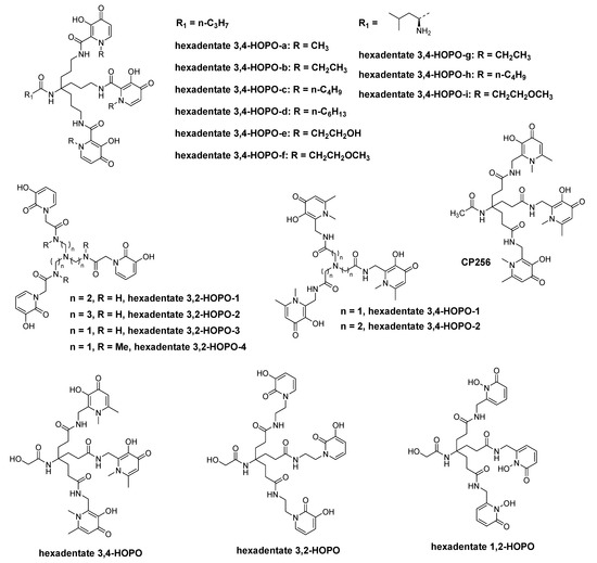 - Cilibrizzi, A.; Abbate, V.; Chen, Y.L.; Ma, Y.; Zhou, T.; Hider, R.C. Hydroxypyridinone journey into metal chelation. Chem. Rev. 2018, 118, 7657–7701. [Google Scholar] [CrossRef] [PubMed]