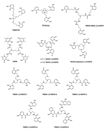- White, D.L.; Durbin, P.W.; Jeung, N.; Raymond, K.N. Specific sequestering agents for the actinides. 16. synthesis and initial biological testing of polydentate oxohydroxypyridinecarboxylate ligands. J. Med. Chem. 1988, 31, 11–18. [Google Scholar] [CrossRef] [PubMed]