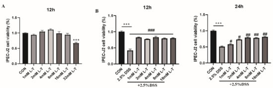 Effect of L-theanine on IPEC-J2 cells viability with/without DSS induction. (A) Cells were treated with the indicated concentrations of L-theanine for 12 h. *** P < 0.001, versus the CON group without L-theanine treatment; (B) Cells were pretreated with the indicated concentrations of L-theanine for 2 h and then stimulated with 2.5% DSS for 12 h and 24 h. The DSS group was obtained in the absence of L-theanine. *** P < 0.001, compared with the CON group. # P < 0.05, ## P < 0.01 and ### P < 0.001 versus DSS group. CON, DMEM without DSS and L-theanine; L-T, DMEM contained L-theanine; DSS, DMEM contained DSS.