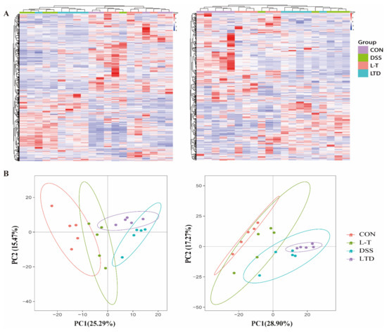 Hierarchical clustering analysis (HCA) (A) and principal component analysis (PCA) (B) of the differences on cellular metabolites among CON, L-T, DSS and LTD groups (n = 5) based on mass spectrometry data acquired in both positive and negative ionization modes.