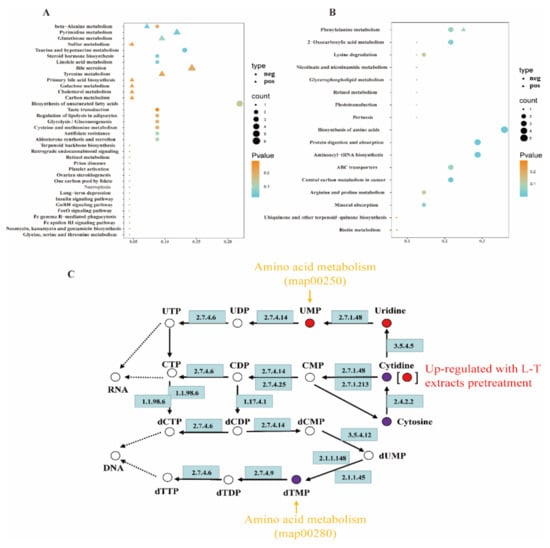 Analysis of the global metabolic pathways with L-theanine and DSS. (A,B) The metabolic pathways enrichment results of the DSS group compared to the control group and LTD group compared to the DSS group with P-value < 0.3. (C) The regulated biomarkers during Pyrimidine metabolism. Cytidine, cytosine, and dTMP (purple point) were down-regulated in the DSS group compared to the CON group. Cytidine, UMP and Uridine (red point) were up-regulated in LTD group compared to DSS group. UMP and dTMP (yellow arrow) are the metabolisms of the amino acids of L-theanine treatment regulation. Different numbers in the blue background indicate different enzymes (refer to KEGG pathway analysis).