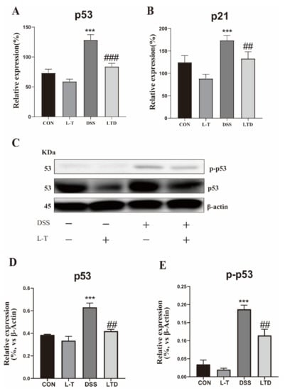 Effect of L-theanine on p53 signaling pathway of IPEC-J2 cells induced by DSS. (A,B) The mRNA relative expression of p53 and p21 genes were detected using RT-PCR assay (n = 6). (C–E) The protein relative expression of p53 and p-p53 were detected using Western blotting assay (n = 3). ** P < 0.01 and *** P < 0.001, compared with the CON group. ## P < 0.01 and ### P < 0.001 versus DSS group.