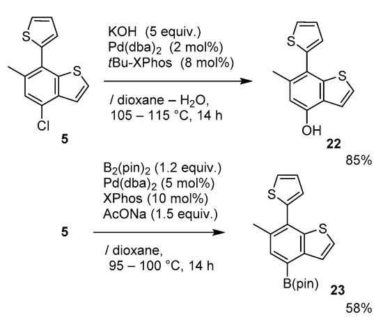 As a further distinctive extension, a couple of heteroatom groups [OH- and (pin)B-] were successfully introduced into benzothiophene 5 using recently developed cross-coupling methods; KOH/Pd(dba)2/tBu-XPhos catalysis [29] provided 4-hydroxybenzothiophene 22, whereas B2(pin)2/Pd(dba)2/XPhos/NaOAc catalysis [30] provided 4-(pin)B-benzothiophene 23 (Scheme 7).