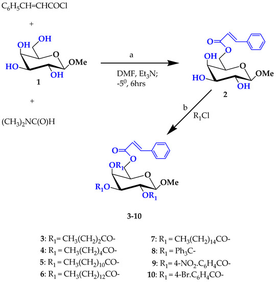 - Kawsar, S.M.A.; Mymona, K.; Asma, R.; Manchur, M.A.; Koide, Y.; Ozeki, Y. Infrared, 1 H-NMR Spectral Studies of some Methyl 6-O-Myristoyl-α-DGlucopyranoside Derivatives: Assessment of Antimicrobial Effects. Int. Lett. Chem. Phys. Astron. 2015, 58, 122–136. [Google Scholar] [CrossRef]