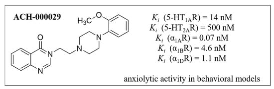 Interestingly, several studies showed reciprocal interactions between adrenergic and serotoninergic systems and the influence of this phenomenon on the pathogenesis of anxiety [11,12]. The modulation of serotonin receptors, another protein belonging to the GPCR family, has already been indicated as a potential strategy for dealing with many CNS disorders including anxiety, especially receptors 5-HT1A [13,14], 5-HT2A [15] and 5-HT7 [16,17]. In this light, searching for multitargeted serotonin/adrenergic agents is a promising solution for the above-mentioned CNS dysfunction treatment. The proof of this hypothesis is confirmation of the anxiolytic activity of compound ACH-000029—a multifunctional quinazoline derivative—in animal models (Figure 2), thus highlighting the importance of further research in this field [12].