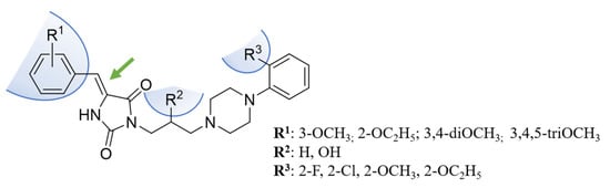 Arylpiperazine is a very widely investigated chemical scaffold as it meets the main structural requirements of a pharmacophore model for many GPCR ligands (serotonin [18,19], histamine [20], adrenergic [21], dopamine receptors [22,23]). However, the non-pharmacophore moiety of the structure also maintains very important factors influencing the compound’s geometry and, therefore, its pharmacodynamic profile. The structure–activity relationship (SAR) analysis for previously reported arylpiperazine derivatives of 5-arylidene hydantoin with a 2-hydroxypropyl linker (Figure 3) led to the selection of the most beneficial substituent combinations, which provided high α1-AR affinity (for the best derivative: Ki = 44.5 nM) [24]. Interestingly, another group of arylpiperazine hydantoins with 2-hydroxypropyl linker (Figure 3) shows lower α1-AR activity (Ki = 230 nM, for the best compound) but high and selective serotoninergic 5-HT7R activity (3 nM < Ki < 94 nM), suggesting that the modulation of hydantoin substitution in position 5 (balancing between sp2 and sp3 hybridization of carbon atom C5) may be one of the main determinants for the serotoninergic/adrenergic affinity profile.