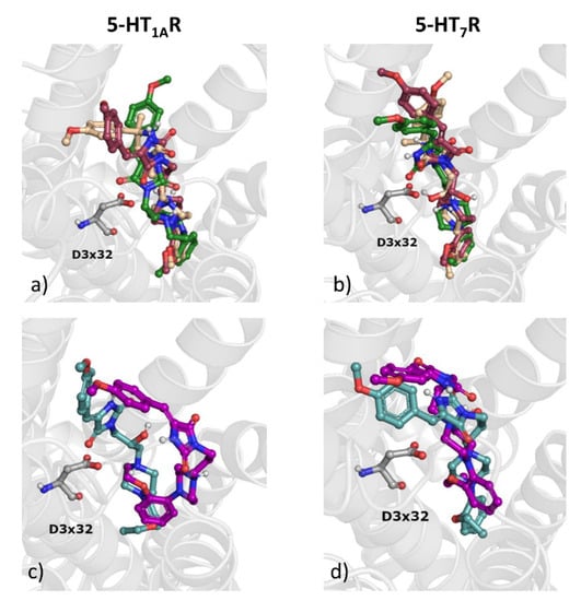 Docking results of selected compounds—3—beige, 6—dark pink, 12—dark green, 7—turquoise, 13—purple to 5-HT1AR (a,c), and 5-HT7R (b,d).