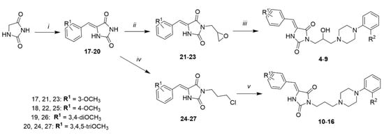Compounds 4–16 were synthesized via a three-step chemical pathway according to Scheme 1. 5-Arylidene hydantoins (17–20) were obtained from hydantoin and a substituted benzaldehyde in Knoevenagel reaction. As we designed derivatives with two types of linkers (branched and unbranched), 2,3-epoxypropan-1-ol was used for N-substitution of position 3 of hydantoin in the Mitsunobu reaction, to obtain compounds 21–23 and 3-chloropropan-1-ol to give compounds 24–27. The final step was a microwave-assisted condensation reaction. In the case of compounds with an epoxide group, no additional reagent was necessary, whereas for compounds with a chloroalkyl group, K2CO3 was used.