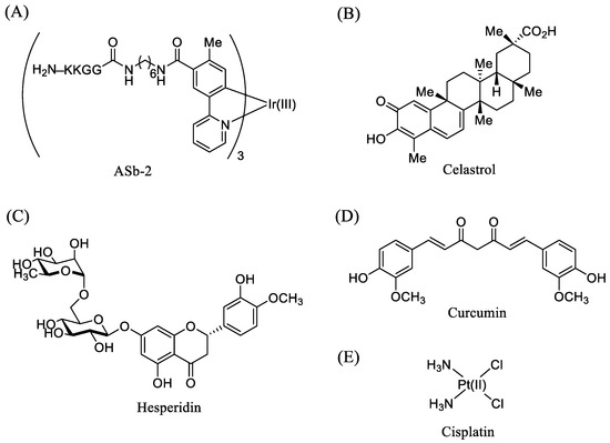 The structures of (A) ASb-2, (B) celastrol, (C) hesperidin, (D) curcumin, and (E) cisplatin.