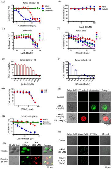 (A) The results of MTT assays of Jurkat cells treated with ASb-2 (red spheres), celastrol (blue diamonds), and hesperidin (green squares) for 24 h at 37 °C. (B) The results of MTT assays of A549 and HeLaS3 cells treated with ASb-2 (100–1.5 µM) for 24 h at 37 °C. (C,D) The results of MTT assays of Jurkat cells treated with ASb-2 and celastrol after the incubation for 1, 3, 6, and 12 h at 37 °C. (E,F) The cell counting results of Trypan blue assays of Jurkat cells treated with AS-2 and celastrol for 24 h at 37 °C. (G) The results of MTT assays of K562 and U937 cells treated with ASb-2 for 24 h at 37 °C. (H) The results of MTT assays of IMR-90 cells treated with ASb-2, celastrol, and hesperidin for 24 h at 37 °C. (I) Typical luminescence confocal microscopic images (Fluoview, FV-1000, Olympus) of Jurkat cells stained with EB (ethidium bromide, 100 µM) in the presence of ASb-2 (50 µM) for 1 h at 37 °C; (J) Typical luminescence confocal microscopic images (excitation at 405 nm and emissions at 520–560 nm were used for ASb-2). Excitation at 473 nm and emissions at 680–730 nm were used for BTPDM1) of Jurkat cells stained with BTPDM1 after treatment for 1 h with ASb-2 (50 µM) at 37 °C. (K) Typical luminescence confocal microscopic images of Jurkat cells treated with celastrol (1 µM) for 24 h at 37 °C and stained with AO (acridine orange, 200 µM) and EB (ethidium bromide, 100 µM).