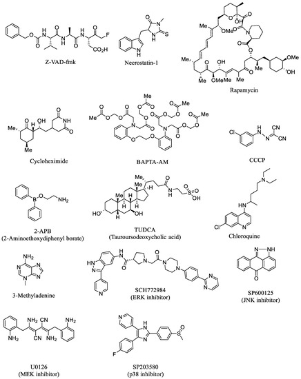 3-(4,5-Dimethyl-2-thiazolyl)-2,5-diphenyl-2H-tetrazolium bromide (MTT), Rhod-2/AM, and Rhod-4/AM were purchased from Dojindo (Kumamoto, Japan). Z-VAD-fmk was purchased from the Peptide Institute and necrostatin-1 was purchased from Enzo Life Science. Opti-MEM media was purchased from Gibco (Grand Island, USA) and acridine orange was purchased from Nacalai Tesque (Kyoto, Japan). Ethidium bromide (EB), ethylene glycol-bis(β-aminoethylether)-N,N,N′,N′-tetraacetic acid (EGTA), the radioimmunoprecipitation assay (RIPA) buffer, Blocking One solution, HIKARI-solution, ChemiLumi One Ultra solution, and NaN3 were purchased from Nacalai Tesque, Japan, and 3-methyladenine, chloroquine diphosphate, bovine serum albumin (BSA), benzylpenicillin potassium, streptomycin sulfate, and monothioglycerol (MTG) were purchased from WAKO Pure Chemical Industries (Osaka, Japan). The Lipofectamine RNAiMAX reagent, ER-RFP, ER-Tracker Red, and LysoTracker Red DND-99 were purchased from Invitrogen and small interfering RNA (siRNA) (LC3-II and ERK1/2), carbonyl cyanide 3-chlorophenylhydrazone (CCCP), and 1,1′,3,3,3′,3′-hexamethylindodicarbocyanine iodide (DilC1(5)) were purchased from Sigma Aldrich (Tokyo, Japan). Rapamycin, cycloheximide, antibodies against caspase-3, PARP, Akt, p-Akt, ERK1/2, p-p38, and p-ERK1/2 were purchased from Santa Cruz Biotechnology (Dallas, TX, USA). Antibodies against BiP, IRE1α, eIF2α, p-eIF2α, JNK1/2, p-JNK1/2, CHOP, LC3-I/II, Atg12, Beclin-1, mTOR, GAPDH, and horse-radish peroxidase (HRP)-conjugated anti-rabbit and anti-mouse secondary antibodies were purchased from Cell Signaling Technology (Beverly, MA, USA). Celastrol, U0126, 2-aminoethoxydiphenyl borate (2-APB), SP600125, SCH772984, SB203580, and tauroursodeoxycholic acid (TUDCA) were purchased from Cayman Chemical Co. (Ann Arbor, MI, USA). Curcumin, hesperidin, and 1,2-bis(2-aminophenoxy)ethane-N,N,N′,N′-tetraacetic acid tetrakis(acetoxymethyl ester) (BAPTA-AM) were purchased from Tokyo Chemical Industry Co., Ltd. (TCI) (Tokyo, Japan), and hesperidin was purified by recrystallization from MeOH/H2O (1/1) because the purity of commercially available hesperidin was ca. 90%.