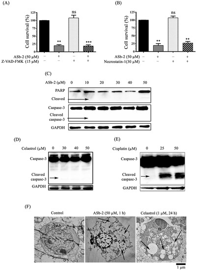 (A) The results of MTT assays of Jurkat cells treated with ASb-2 (50 µM) in the presence of Z-VAD-FMK (15 µM) (a broad caspase inhibitor) for 1 h at 37 °C. (B) The results of MTT assays of Jurkat cells with ASb-2 in the presence of necrostatin-1(30 µM) (a necroptosis inhibitor) for 1 h at 37 °C. (C–E) Western blot analysis of apoptosis-related proteins in Jurkat cells treated with ASb-2, celastrol, and cisplatin, respectively. (F) TEM images of Jurkat cells after the treatment with ASb-2 (50 µM, 1 h) and celastrol (30 µM, 24 h) at 37 °C. Arrows indicate cytoplasmic vacuolization in Jurkat cells induced by ASb-2 and celastrol, respectively. ** p < 0.01 and *** p < 0.001 indicate the significant differences from the control. ns: not significant (the statistical data in Figure 4A,B are listed in Table S1 in the Supporting Information).