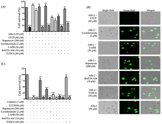 (A) The results (cell survival) of MTT assays of Jurkat cells treated with ASb-2 (50 µM) in the presence of CCCP (40 µM), rapamycin (200 nM), cycloheximide (2 µM), 2-APB (50 µM), BAPTA-AM (10 µM), and TUDCA (40 µM) for 1 h at 37 °C. (B) Typical microscopy images (Biorevo, BZ-9000, Keyence) of Jurkat cells treated with ASb-2 (50 µM) in the presence of CCCP (40 µM), rapamycin (200 nM), cycloheximide (2 µM), 2-APB (50 µM), BAPTA-AM (10 µM) and TUDCA (40 µM) for 1 h at 37 °C. Scale bar: 20 µm (C) The results of MTT assays of Jurkat cells treated with celastrol in the presence of CCCP (40 µM), rapamycin (200 nM), cycloheximide (2 µM), 2-APB (50 µM), BAPTA-AM (10 µM) and TUDCA (40 µM) for 24 h at 37 °C. * p < 0.05, ** p < 0.01, and **** p < 0.0001 indicate significant differences from the control. ns: no significant (the statistical data in Figure 5A,C are listed in Table S2 in the Supporting Information).