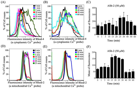 (a) Measurement of intracellular Ca2+ level: Jurkat cells (1.0 × 106 cells/mL, 100 μL) were treated with Rhod-4/AM (5 µM) or Rhod-2/AM (5 µM) in RPMI 1640 medium containing 10% (v/v) FBS and 1% (v/v) penicillin/streptomycin under a 5% CO2 atmosphere at 37 °C for 30 min. After staining, the cells were washed twice with PBS and incubated with ASb-2 (50 µM), celastrol (30 µM), or curcumin (50 µM) under a 5% CO2 atmosphere at 37 °C for a given incubation time. After the incubation, the cells were washed with PBS and analyzed by flow cytometry (FACS Calibur cytometer, Becton), and the data were analyzed on FlowJo software (FlowJo, LCC). Vehicle contols were used in the experiment.