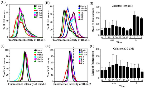 (A–C) Flow cytometric analysis of Jurkat cells stained with Rhod-4/AM (5 µM), followed by treatment with ASb-2 (50 µM) at 37 °C. (D–F) Flow cytometric analysis of Jurkat cells stained with Rhod-2/AM (5 µM), followed by treatment with ASb-2 (50 µM) at 37 °C. (G–I) Flow cytometric analysis of Jurkat cells that had been treated with celastrol (30 µM) and stained with Rhod-4/AM (5 µM) at 37 °C. (J–L) Flow cytometric analysis of Jurkat cells that had been treated with celastrol (30 µM) and stained with Rhod-2/AM (5 µM) at 37 °C.