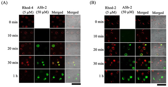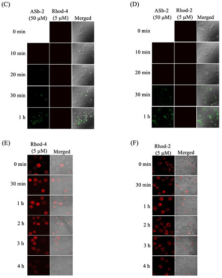 (c) Measurement of intracellular Ca2+ level: Jurkat cells were treated with Rhod-4/AM (5 µM) or Rhod-2/AM (5 µM) for 30 min, after which the cells were washed twice with PBS and incubated with ASb-2 (50 µM), celastrol (30 µM), or curcumin (50 µM) for 0–4 h. After the incubation, the cells were washed with PBS and then observed by confocal microscopy as described above. Excitation at 559 nm and emissions from 570 to 620 nm were used for Rhod-2 and Rhod-4.