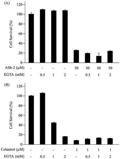 (A) The results of MTT assays of Jurkat cells treated with ASb-2 (50 µM) in the presence of EGTA (0.5, 1, and 2 mM) for 1 h at 37 °C. (B) The results of MTT assays of Jurkat cells treated with celastrol (1 µM) in the presence of EGTA (0.5, 1, and 2 mM) for 24 h at 37 °C.