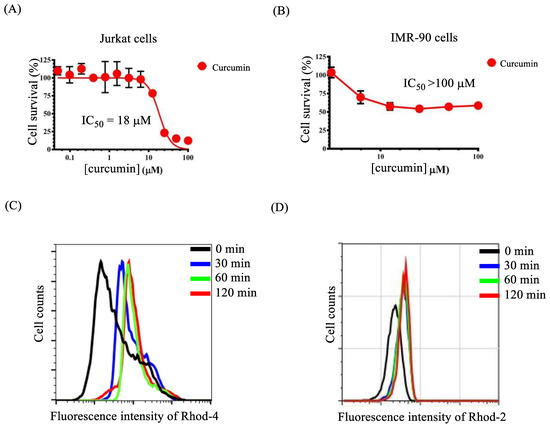 (A) The results of MTT assays of Jurkat cells treated with curcumin for 24 h at 37 °C. (B) The results of MTT assays of IMR-90 cells treated with curcumin for 24 h at 37 °C. (C) Flow cytometry analysis of Jurkat cells treated with curcumin (50 µM) and then stained with Rhod-4/AM (5 µM) for 30, 60, and 120 min at 37 °C. (D) Flow cytometry analysis of Jurkat cells treated with curcumin (50 µM) and then stained with Rhod-2/AM (5 µM) for 30, 60, and 120 min at 37 °C.