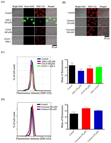 The mitochondrial membrane potential (ΔΨm) of Jurkat cells was measured in the presence of ASb-2, celastrol (a paraptosis inducer), and curcumin (an apoptosis inducer). Jurkat cells were pre-treated with or without CCCP (40 µM), which is known as an uncoupling reagent and an inhibitor of the ASb-2-induced cell death (Figure 5A,B), for 1 h, and then treated with ASb-2 (50 µM), celastrol (30 µM), or curcumin (50 µM) for 1 h, after which the ΔΨm values were measured by using DilC1(5) (500 nM) by confocal microscopy and flow cytometry. The confocal microscopic images and flow cytometric analysis shown in Figure 10A,C suggest that the ΔΨm values are decreased by ASb-2 (50 µM) and restored in the presence of CCCP (40 µM). These results imply that CCCP cancels Ca2+ overload by compromising the membrane potential of mitochondria [40,43,44] and the decrease in ΔΨm induced by ASb-2. Interestingly, a small increase in ΔΨm was observed by the treatment with celastrol and curcumin, as shown in Figure 10B,D, although the details are yet to be studied.