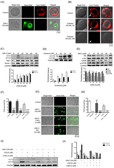 (A,B) Typical luminescence confocal microscopic images (Fluoview, FV-1000, Olympus) of Jurkat cells stained with LysoTracker red in the presence of ASb-2 (50 µM, 1 h) and celastrol (30 µM, 1 or 24 h) at 37 °C. (C) Autophagy markers such as LC3-I/II, Atg12, and beclin-1 were confirmed by Western blot analyses in Jurkat cells for 1 h at 37 °C. (D) LC3-I/II expression levels were confirmed by Western blot analyses in the presence or absence of celastrol in Jurkat cells for 1 h at 37 °C. (E) Western blot analyses in Akt/mTOR signaling pathway. (F) The results of MTT assays of Jurkat cells treated with ASb-2 (50 µM) in the presence of CQ (25 µM) and 3-MA (5 mM) for 1 h at 37 °C. (G) Typical microscopy images (Biorevo, BZ-9000, Keyence) of Jurkat cells treated with ASb-2 (50 µM) in the presence of 3-MA (5 mM) and CQ (25 µM) for 1 h at 37 °C. (H) The results of MTT assays of Jurkat cells that had been treated with celastrol (1 µM) in the presence of CQ (25 µM) and 3-MA (5 mM) for 24 h at 37 °C. (I,J) The results of Western blot analyses of LC3-I/II in Jurkat cells treated with ASb-2 in the presence or absence of CQ and 3-MA for 1 h at 37 °C. * p < 0.05, ** p < 0.01, and **** p < 0.0001 indicate the significant differences from the control. ns: not significant (the statistical data in Figure 11F,H are listed in Table S3 in the Supporting Information).