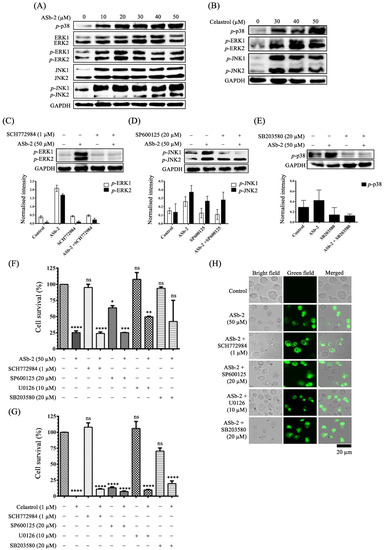 - Although the expression of LC3-I/II, a typical autophagy marker, was dramatically changed after the treatment of Jurkat cells with ASb-2 and celastrol (Figure 11C,D), negligible inhibition of cell death was observed in the presence of 3-MA and CQ (Figure 11F–J), suggesting that autophagy is not responsible for the paraptosis caused by ASb-2 and celastrol. Moreover, the phosphorylation of ERK, JNK, and p38, members of the MAPK signaling pathway, was gradually upregulated by ASb-2 and celastrol and this upregulation was dose-dependent (Figure 12A,B). However, the pre-treatment with MAPK inhibitors such as SCH772984, SP600125, U0126, and SB203580 had little effect on blocking the cell death by ASb-2 (1 h) and celastrol (24 h) (Figure 12C–H). These results suggest that the MAPK signaling pathway is not the main pathway for ASb-2-induced paraptosis.