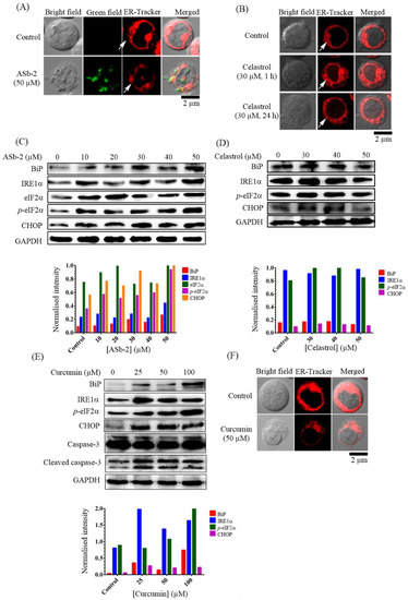 (A) Typical luminescence confocal microscopic images (Fluoview, FV-1000, Olympus) of Jurkat cells stained with ER-Tracker Red in the presence of ASb-2 (50 µM) for 1 h at 37 °C. (B) Typical confocal microscopic images (Fluoview, FV-1000, Olympus) of Jurkat cells stained with ER-Tracker Red in the presence of celastrol (30 µM) for 1 or 24 h at 37 °C. (C) Western blot analyses of ER stress markers such as BiP, IRE1α, eIF2α, p-eIF2α, and CHOP in the presence or absence of ASb-2 at various concentrations in Jurkat cells for 1 h at 37 °C. (D) The expression levels of BiP, IRE1α, p-eIF2α, and CHOP were confirmed by Western blot analyses in the presence or absence of celastrol at various concentrations in Jurkat cells for 1 h at 37 °C. (E) The expression levels of BiP, IRE1α, p-eIF2α, and CHOP were confirmed by Western blot analyses in the presence or absence of curcumin at various concentrations in Jurkat cells for 1 h at 37 °C. (F) Typical luminescence confocal microscopic images (Fluoview, FV-1000, Olympus) of Jurkat cells stained with ER-Tracker Red in the presence of curcumin (50 µM) for 1 h at 37 °C.