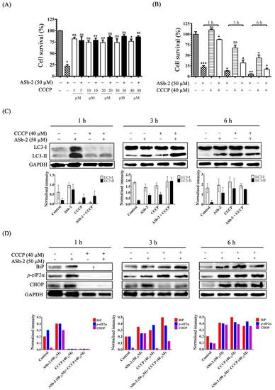 (A) The results of MTT assays of Jurkat cells treated with ASb-2 (50 µM) in the presence of CCCP (0–40 µM) for 1 h at 37 °C. (B) The results of MTT assay of Jurkat cells that had been treated with ASb-2 in the presence of CCCP (40 µM) for 1, 3, and 6 h at 37 °C. (C) Western blot analysis of LC3-I/II expression of Jurkat cells that had been treated with ASb-2 (50 µM) in the presence of CCCP (40 µM) for 1, 3, and 6 h at 37 °C. (D) Western blot analysis of BiP, p-eIF2α and CHOP in Jurkat cells treated with ASb-2 in the presence of CCCP for 1, 3, and 6 h at 37 °C. * p < 0.05, ** p < 0.01, and *** p < 0.001 indicate the significant differences from the control. ns: no significant (the statistical data in Figure 14A,B are listed in Table S5 in the Supporting Information).