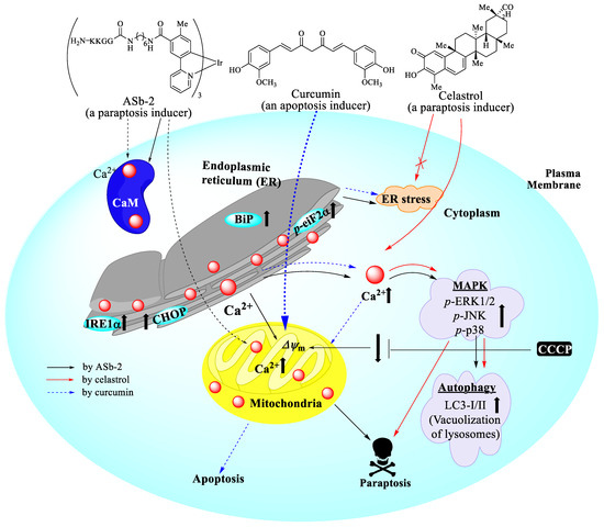- Based on the aforementioned results, we speculate that cell death possibly involves the inhibition of the complexation of Ca2+ with CaM or the interaction of the Ca2+–CaM complex with its downstream target proteins [44], followed by an extensive overload of Ca2+ from the ER to mitochondria (Figure 6A–F), which is associated with ER stress (Figure 13A,C). These phenomena induce the loss of ΔΨm (Figure 10A–D) related to mitochondrial dysfunction, resulting in a paraptosis with vacuolization of intracellular organelles such as lysosomes and the ER in Jurkat cells (Scheme 1). On the other hand, ER stress markers had a negligible effect after treatment with celastrol (Figure 13D), which increases cytoplasmic Ca2+ concentrations to induce paraptosis in Jurkat cells, suggesting that ASb-2 and celastrol induce paraptosis via different signaling pathways. It has been reported that the ER and mitochondria are main reservoirs for intracellular Ca2+ [73] and that damage to the ER and mitochondria by Ca2+ distribution, Ca2+ overload, and a loss of Ca2+ homeostasis induces cytotoxicity, oxidative stress, and mitochondrial dysfunction, resulting in PCD such as paraptosis [77], although the molecular target of ASb-2 has not been precisely identified. It was also found that curcumin increases cytoplasmic and mitochondrial Ca2+ concentrations and ER stress to induce apoptosis in Jurkat cells (Figure 9C,D and Figure 13E,F).