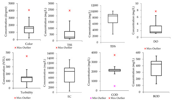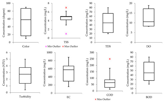 Boxplots were also developed to assess the nature of data distribution among the water quality parameters investigated in raw wastewater. Figure 1 indicates that the median lines for color, TDS, and BOD are closer to the upper quartile, meaning the distribution of data from the water quality parameters in the raw wastewater is negatively skewed. This shows that the data constituted a higher frequency of low concentration values than the high concentration values. For instance, the data distribution for color had most of the concertation values within the range of 1000 degrees and slightly below 2000 degrees, while TDS had most of the concentration values ranging from slightly above 6000 mg/L and below 9000 mg/L. A similar trend was observed in the literature according to the study conducted by Hajira and Abdul [41], whereby the textile wastewater from Karachi City’s industrial zone was investigated. Also, the median line for COD is closer to the middle, indicating that the COD data distribution is symmetric or normal, while that of TSS and DO are observed to be closer to the lower quartile, meaning the data constituted a higher frequency of high concentration values than low concentration values (“positively skewed”).