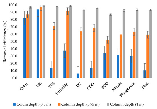 In general, the 0.75 m column depth achieved removal efficiencies ranging from 52.3% to 97.5%, whereas the 1 m column depth achieved removal efficiencies ranging from 86.9% to 99.4%. The highest removal efficiency was achieved from the combination of TSS and the 1 m column depth. The results in this study are in agreement with the results obtained from the study conducted by El beid et al. [49], which investigated the performance of the filtration process for the treatment of pig slurry by using marine sands, silty loam soils, fly ash, and zeolite; in the study, a column of 0.5 m of zeolite was used to achieve removal efficiencies of up to 99.9% for EC, TSS, COD, and BOD.