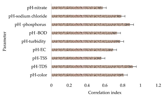 Table 2 indicates that EC is highly correlated with all the other studied parameters in this group, with a correlation index ranging from 0.86 to 0.99. The phenomenon is likely linked to the fact that EC is a measure of water’s general capability to allow the flow of electricity. To achieve this, the water has to be rich in terms of ion concentration. These conductive ions come from dissolved salts and other inorganic materials that can be expressed in terms of other water quality parameters such as TDS. Linear correlation among these parameters has been observed in the literature [44]. Furthermore, the reason that the determination of EC in water is important is that it provides a picture of how much of the dissolved substances, chemicals, and minerals are present in the water.