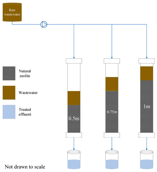 It was also important to take into account the equal distribution of flow in the columns and, to achieve this, the top surfaces of the columns were covered by perforated plates with evenly distributed holes. The system used a 120 L storage drum to continually feed the columns at a controlled rate of (0.0035 L/s). The wet-packing approach of the porous medium was used to minimize layering and air entrapment inside the filing. All three zeolite columns were mounted vertically, and glass wool was used at the bottom of the column, acting as a supporting material of the adsorbent bed. After packing the column, deionized water was passed through it for some time, followed by the introduction of the feed water. The filtrate samples were collected at a regular time interval (every 2 h on average, when the collection jars were almost full). To avoid data errors resulting from an exhausted (saturated) media treating the highly polluted wastewater and only capturing the effect of column depth on the removal efficiency, the media had to be changed after every five days.