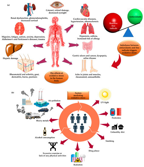 Environmental pollution, climatic changes, and unhealthy lifestyles have increased the prevalence of serious and chronic diseases and age-related disorders [1]. Evidence from toxicological investigations on cultured cells and animal models has shown a strong and direct relationship between exposure to hazardous pollutants and generation of oxidative stress, leading to the development of a plethora of pathological diseases such as renal failure [2], atherosclerosis [3], diabetes [4], systemic inflammation [5], acute respiratory syndrome [6], asthma [7], Alzheimer’s and Parkinson’s disorders [8], certain types of cancer [9], and arthritis [10], etc. (Figure 1). In 1985, the concept of oxidative stress was formulated by Helmut Sies in the book entitled “Oxidative Stress” to describe the disruption of the balance between antioxidative defenses and oxidant molecules [11]. The imbalance between oxidants and the cellular defensive antioxidants triggers oxidative stress. In 1956, the term ‘reactive species” was coined to refer to oxidizing radicals [12].