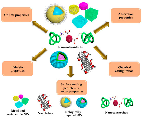 Nanotechnology has opened up new horizons to explore creative solutions for the treatment of oxidative stress-related disorders. Progress in nanotechnology has revolutionized the potential use of a number of nanomaterials as effective nanoantioxidants [43,44,45,46]. Nevertheless, the antioxidant capacity of these nanostructures varies according to their chemical configuration, nature, surface charge, crystallinity, particle size, and surface coating [47]. Recently, engineered nanoparticles (NPs) and nanocomposites have been considered as nouveau tools for the development of innovative nanoantioxidants with enhanced properties for health longevity. The integration of nanoscience with biomedicine for the development of nanoantioxidant therapy has witnessed a significant breakthrough, leading to major progress in the pharmaceutical and biotechnological industries [48]. Indeed, nanoscience has provided promising solutions to address the challenges associated with conventional antioxidant compounds and to enable the development of pioneering classes of nanoantioxidants [49]. More interestingly, many categories of nanoantioxidants have potent radical scavenging and quenching capacities that have shown greater antioxidative sturdiness and more resistance to severe microenvironments than natural antioxidants. Nanoantioxidants improve the pharmacokinetics of natural antioxidant molecules by preventing their rapid degradation under stress conditions either through nanoencapsulation or nanodelivery [50]. Although antioxidant-functionalized nanostructures have displayed tremendous potential in animal experiments, clinical studies in humans remain elusive.