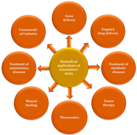 Nanoantioxidant biomedical applications have significantly advanced the biotechnological and pharmaceutical industries, with remarkable progress in the field of antioxidant therapy [64]. Nanoantioxidants have shown promising results to address the challenges associated with conventional antioxidants and have enabled the development of an innovative class of antioxidants [49]. They exhibit high antioxidative potential and high tolerance to harsh microenvironments. The potential use of nanoantioxidants has been reported for several biomedical applications, such as treatment of autoimmune and metabolic diseases [65,66], wound healing [67], tumor therapy [48], drug delivery [68], gene delivery [69], theranostics [70] (Figure 4). The subsections that follow describe the most common and pioneer types of nanoantioxidants based on the previously published literature.
