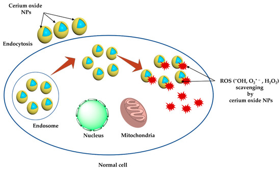 Antioxidant effect of cerium oxide NPs in normal cell under physiological pH via endocytosis and then scavenging ROS, such as •OH, O2•−, and H2O2 as a result of SOD mimetic activity, by which O2•− is reduced to H2O2 and CAT activity by which H2O2 is further degraded into H2O, and hence providing protection to normal cells.