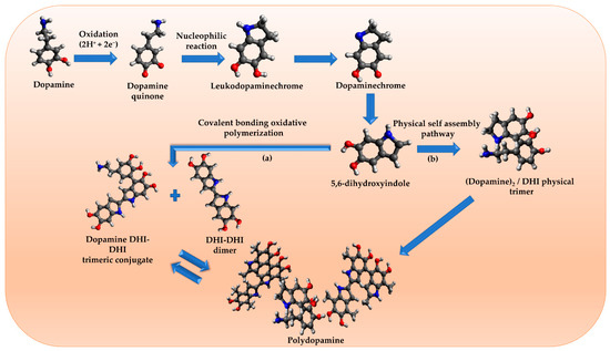 The two pathways applied for polydopamine polymerization, (a) covalent bonding oxidative polymerization and (b) physical self-assembly.